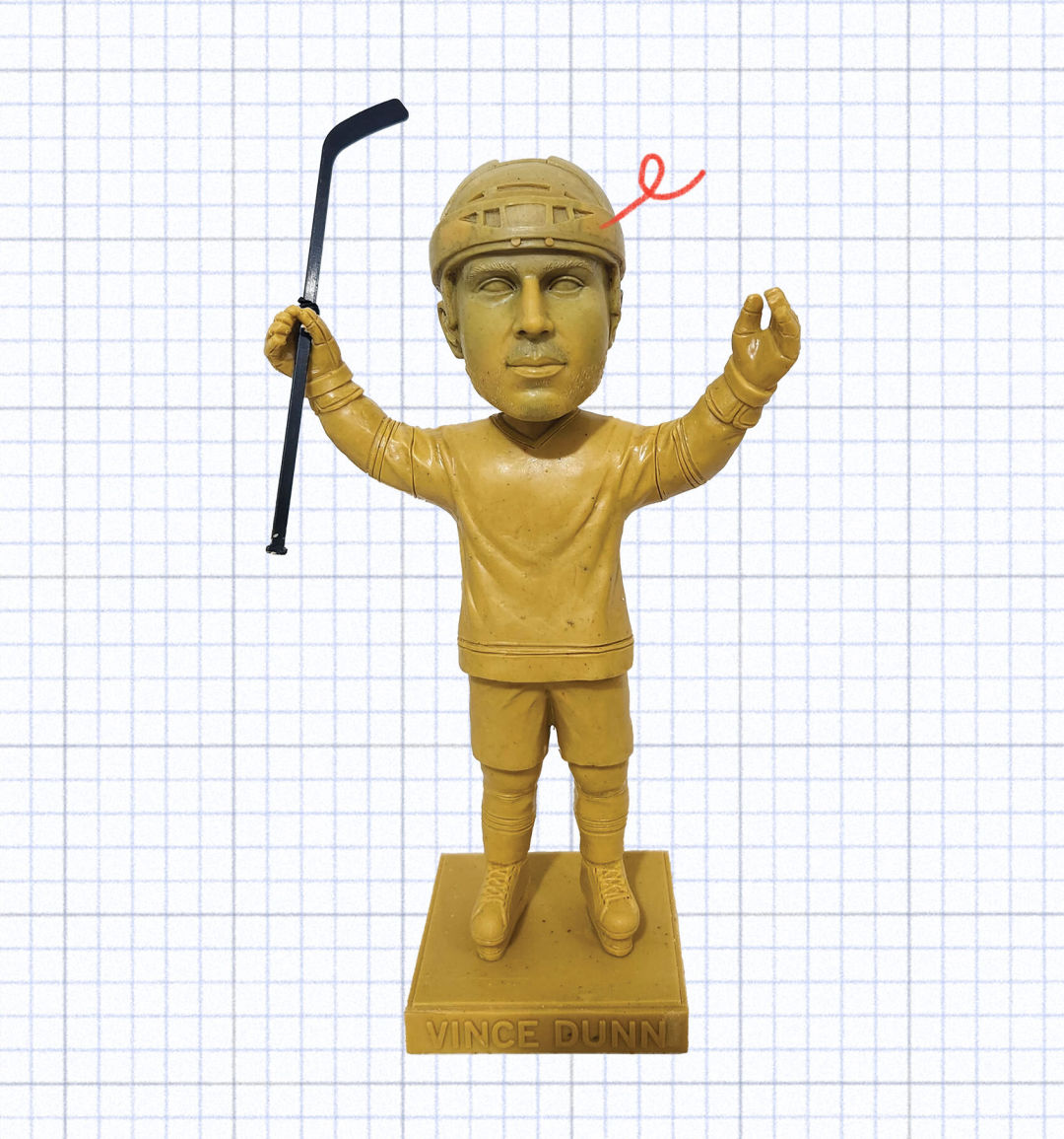The process starts with a photo, then—after a rendering or two—moves to a clay prototype before, finally, paint. This Vince Dunn bobblehead went through 17 revisions.