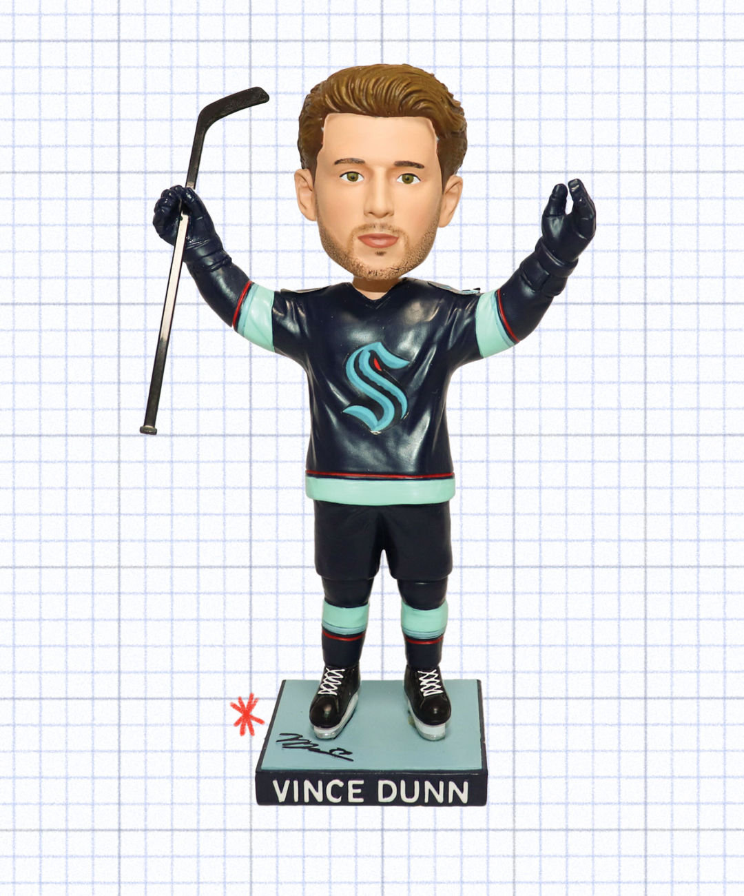 Shabz and the Kraken partner with a locally based merchandiser called BDA to produce their bobbleheads. It’s a collaborative process, in which Shabz and her team work with BDA artists to get everything just right, from the texture of a player’s beard to the materials used for packaging. (They try to avoid plastic; it turns out Climate Pledge is more than just the name of their arena.) And it’s not over until the 10,000 dolls the team distributes for each promotion have been unloaded from their pallets and handed out to anxious fans. No detail is too small, Shabz says. “They are all my children.”