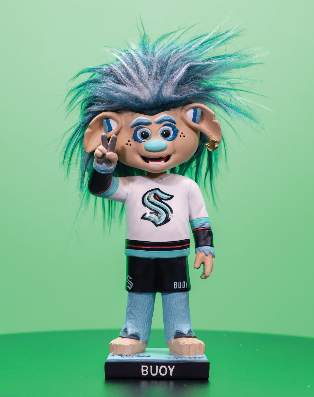 Buoy’s bobblehead was designed to capture the mascot’s chaotic essence, with troll hair atop his polyresin body. “It was just a crazy idea I had,” says Shabz. Putting strands of hair on a bobblehead was a first for BDA and the Kraken. But it was the right call. “This one just felt more Buoy.”
