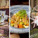 Collage showing Wind Creek Bethlehem North Tower room with champagne service on gold side table, colorful ahi tuna poke bowl, and guest relaxing in white robe on suspended swing chair at spa overlooking SteelStacksCollage showing Wind Creek Bethlehem North Tower room with champagne service on gold side table, colorful ahi tuna poke bowl, and guest relaxing in white robe on suspended swing chair at spa overlooking SteelStacks
