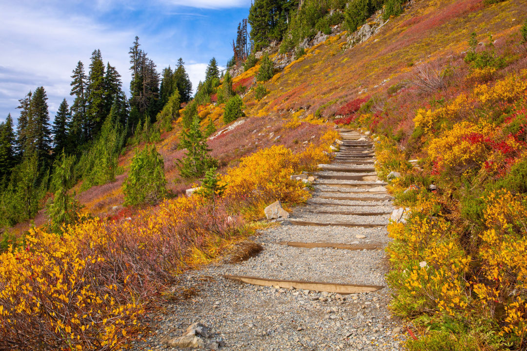 Fall color explodes along the paved trails in Mount Rainier’s Paradise meadows.