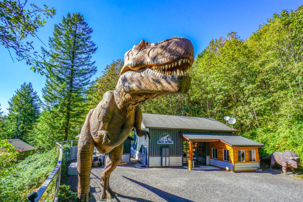 The two-acre property just north of the Columbia River is ruled by life-size motion-controlled dinosaurs, from a Brachiosaurus that gently moves as cars pass through the entrance gate to a roaring Tyrannosaurus rex just outside the front door.