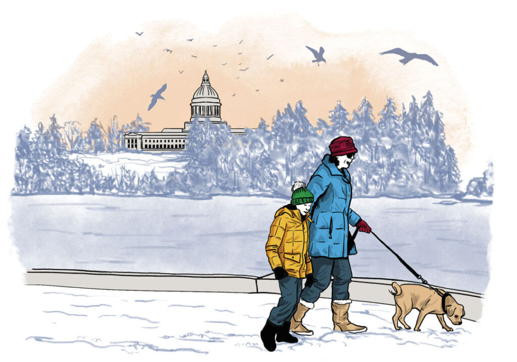 Capitol Lake, formed in 1951 with a small dam, sits between the government campus and Puget Sound. A state project plans to return it to its natural estuary form in the 2030s, with the Department of Ecology taking lead this year. When this end of the Deschutes River is once again marshy, seawater will fill and empty the area with every tide.