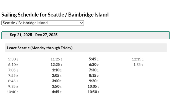 Get there. The schedule of today’s ferry from Seattle to Bainbridge is here. You can also look at the ferry schedule and films scheduled for Bainbridge Film Festival this weekend.