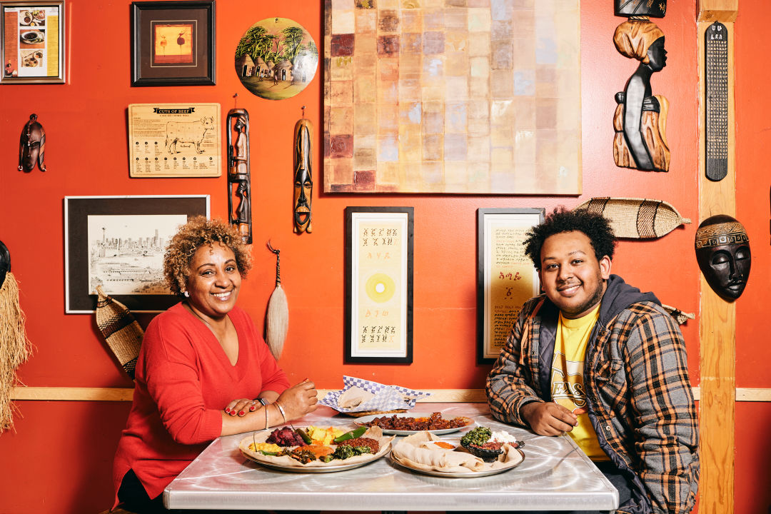Ahadu’s welcoming chef and owner Menbere Medhane, with son Raeye.