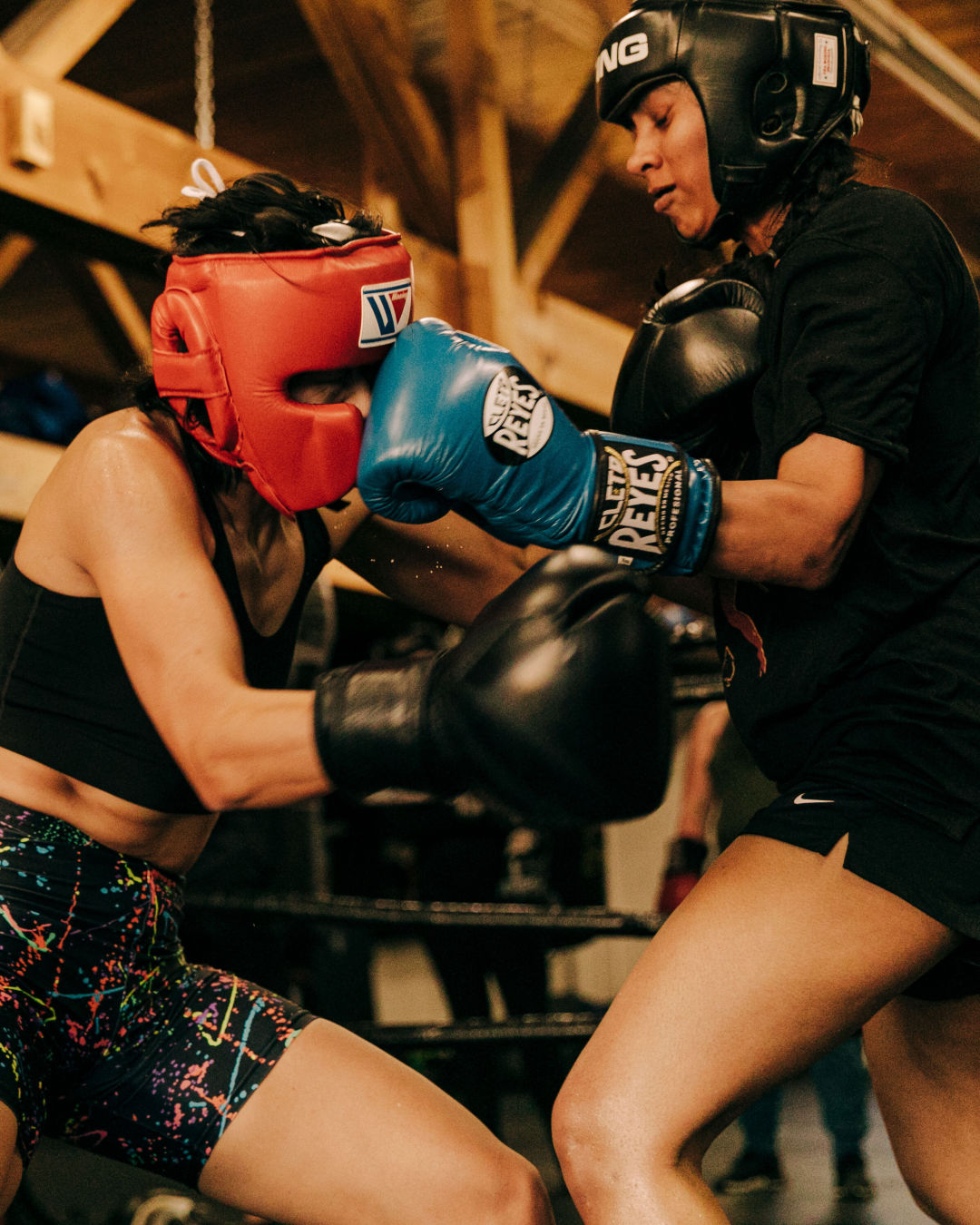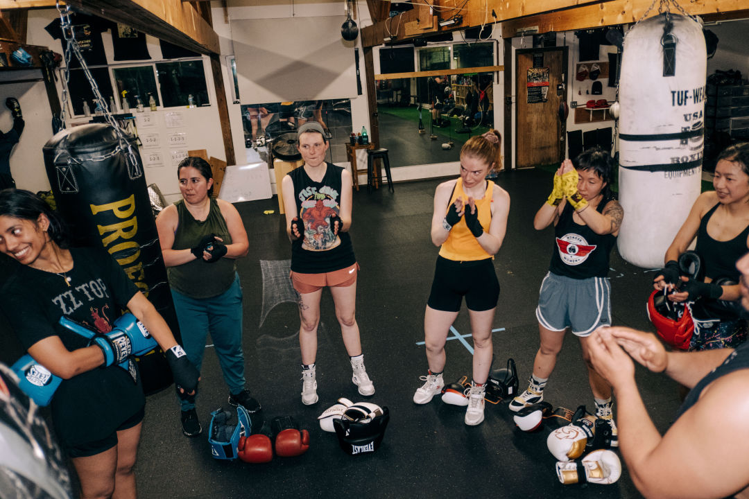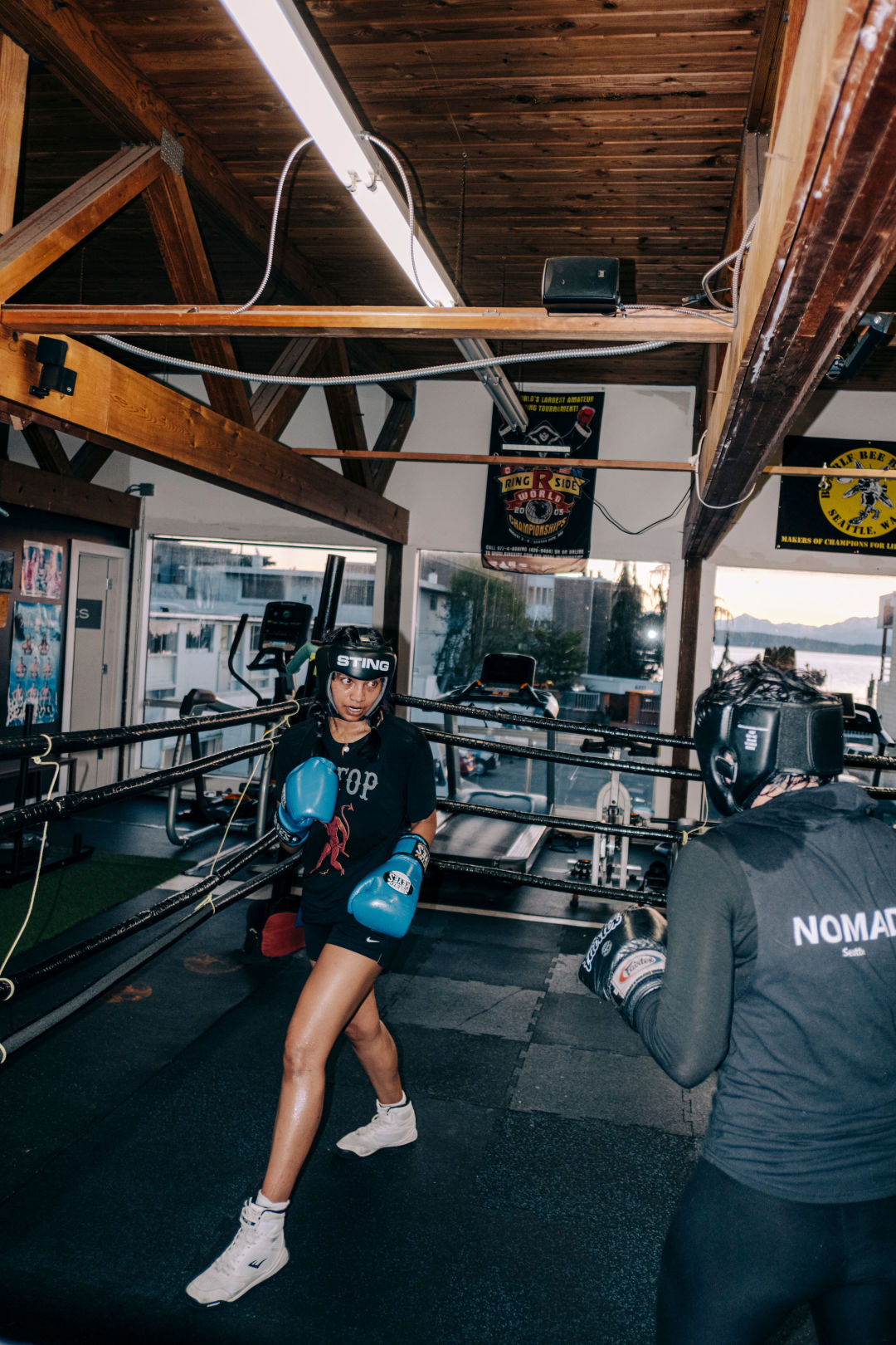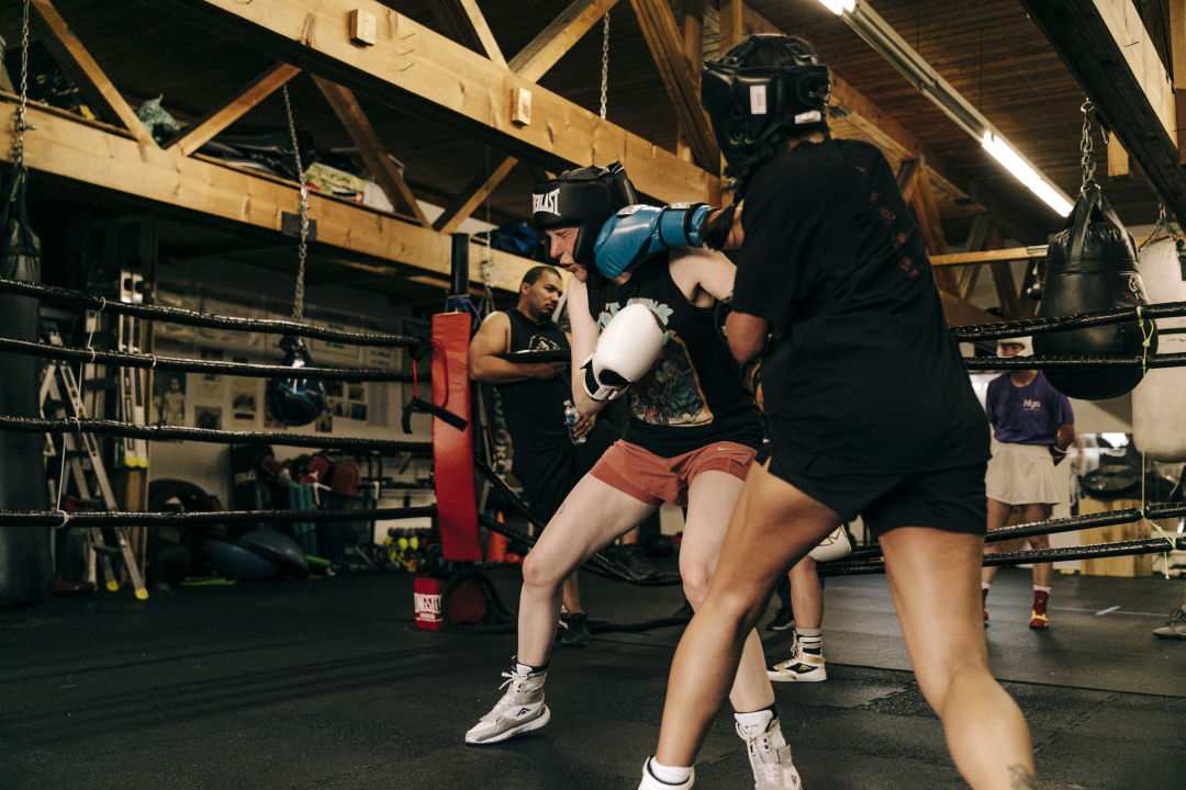 Nomad Boxing Club is a scrappy local gym in Ballard. Heavy bags sway from the rafters, and it smells faintly of old socks and disinfectant. Most of the fights showcased in the newspapers, photos, and posters that paper the walls feature men—Floyd Mayweather, Oscar De La Hoya, Muhammad Ali—but it’s the only boxing gym in the region that offers weekly opportunities for women to spar with other women. Some of these women are on Nomad’s boxing team and actively train for USA Boxing–sanctioned fights. Others, like me, simply show up for the challenge of it and the fierce bonds that form after repeated bouts in the ring. As my fellow Nomad boxer Neal Haley (who’s here battling with Liann Yamashita in the top image, which Manny Dunham watches from the corner) likes to say, “The punching-each-other-in-the-head-to-best-friend pipeline is real.”