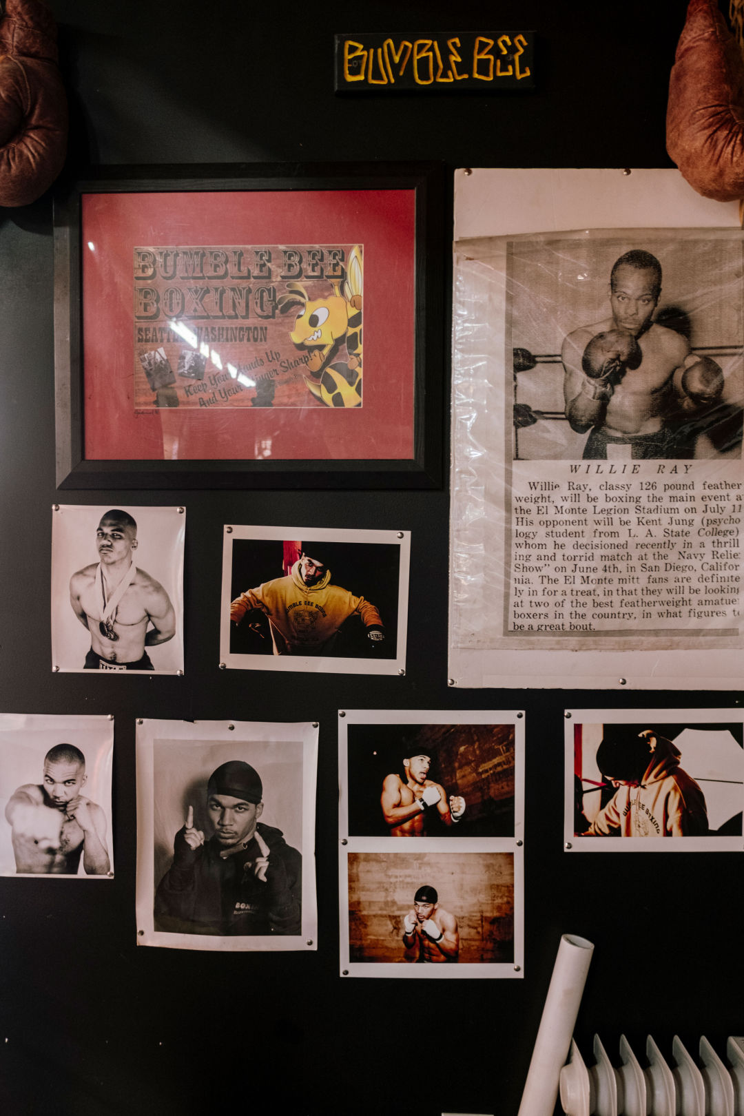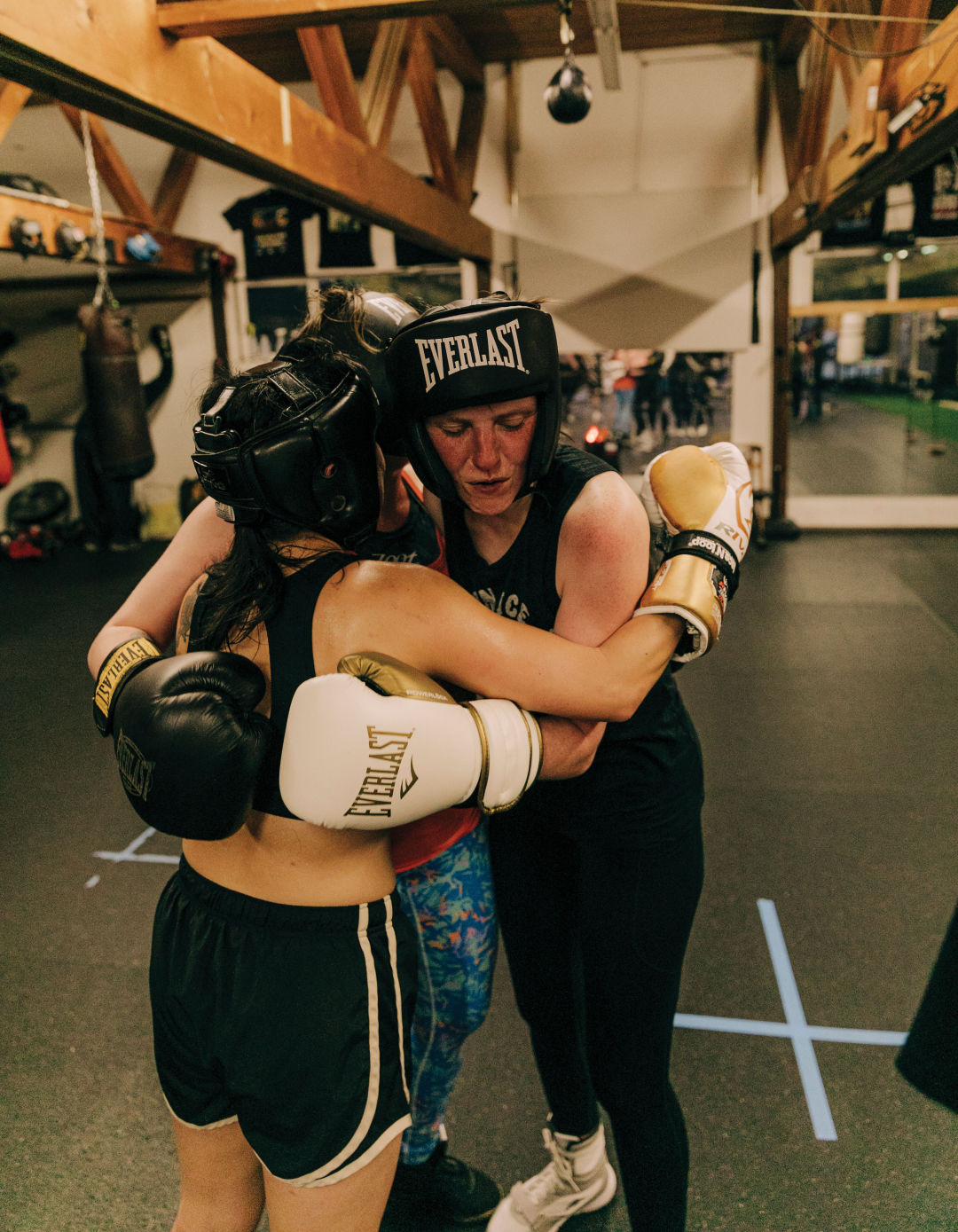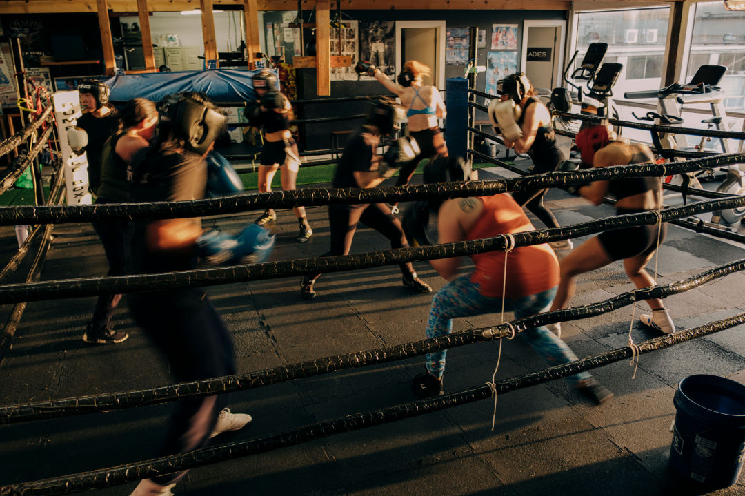 Nomad Boxing Club is a scrappy local gym in Ballard. Heavy bags sway from the rafters, and it smells faintly of old socks and disinfectant. Most of the fights showcased in the newspapers, photos, and posters that paper the walls feature men—Floyd Mayweather, Oscar De La Hoya, Muhammad Ali—but it’s the only boxing gym in the region that offers weekly opportunities for women to spar with other women. Some of these women are on Nomad’s boxing team and actively train for USA Boxing–sanctioned fights. Others, like me, simply show up for the challenge of it and the fierce bonds that form after repeated bouts in the ring. As my fellow Nomad boxer Neal Haley (who’s here battling with Liann Yamashita in the top image, which Manny Dunham watches from the corner) likes to say, “The punching-each-other-in-the-head-to-best-friend pipeline is real.”
