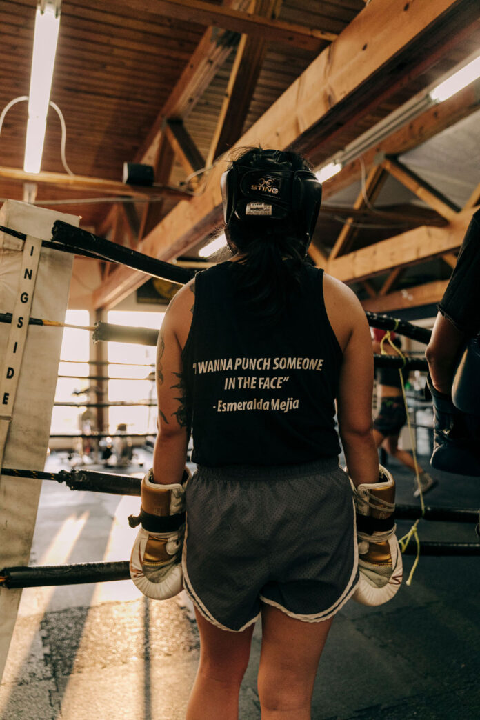 Neal Haley (above) started boxing eight years ago for fitness. Then, about two years ago, she started training consistently with the team. She also serves on the board for the nonprofit arm of the gym and teaches classes. Sparring nights are still challenging for Haley, too. The ring is a panic-inducing space, and she admits that when she first started sparring she was just “getting beat up for a year.” But when she thought about quitting, teammate Peiji Wang took her aside and asked, “What happens if you just stick with it?” Like Oishi, Haley realized getting frustrated doesn’t help. Since there’s always more to learn with boxing, she focuses on fine-tuning her technique. “Execute the movement, not the opponent,” Coach Manny reminds the team.