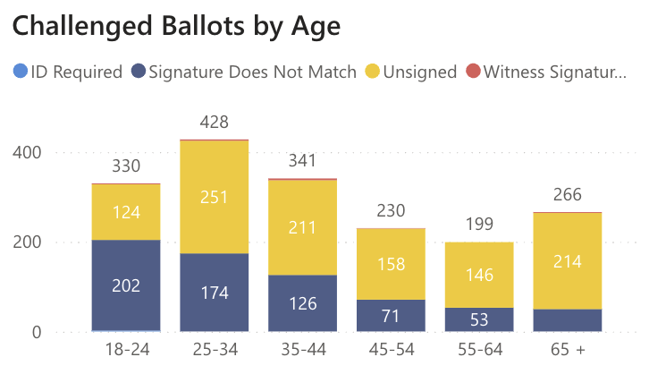 Voters across all demographics are fucking up their signatures, but particularly the young people. Voters under the age of 35 account for 42 percent of the current challenged ballots. Surprisingly, the 25 to 34-year-olds are fucking this up more than the 18 to 24-year-olds with 428 challenged ballots. Though, not by much. The youths have 330 challenged ballots. Don’t get all high and mighty, elder millennials, the 34 to 44-year-olds also have 341 challenged ballots. You’re not “adulting.” You’re a mess.